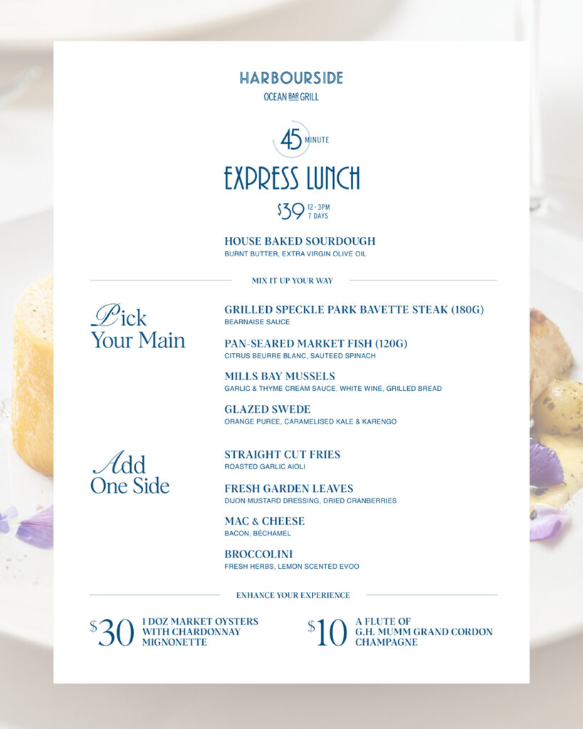 Kindly note, the 45-minute service applies exclusively to guests ordering from the Express Lunch Menu without modifications or additional courses.